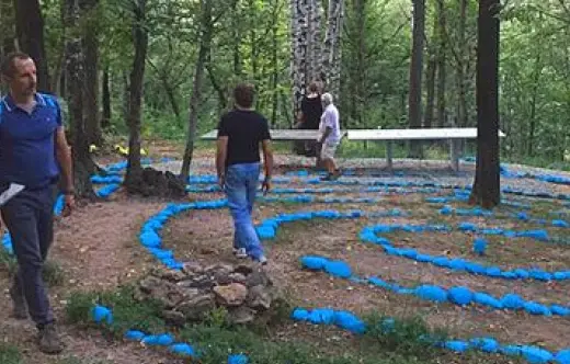 Nel Tempio Bosco Sacro sono stati creati molti percorsi a forma di spirali e labirinti, con pietre poste a terra allegramente colorate.